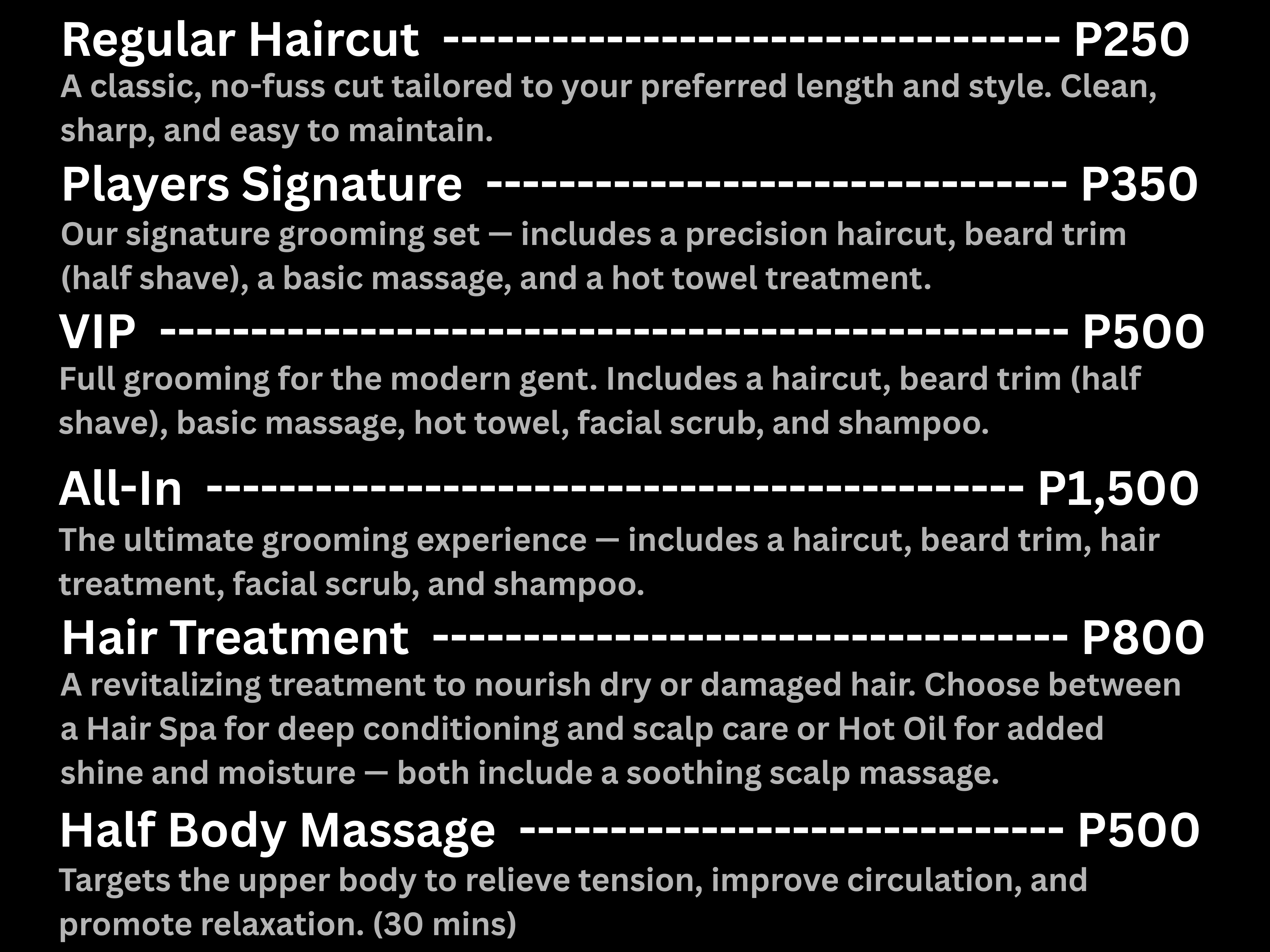Players Barbers was born in the cool mountain air of Baguio City in 2019, driven by a mission to deliver top-tier grooming with style, precision, and passion. What began as a local barbershop quickly grew into a trusted name in men's grooming, with seven thriving branches across Baguio, making it easier than ever for our loyal customers to drop in and stay sharp. In response to growing demand and continuous support from our community, Players Barbers expanded to La Union, bringing our signature fresh fades and clean cuts to the surfers, students, and locals of the North.