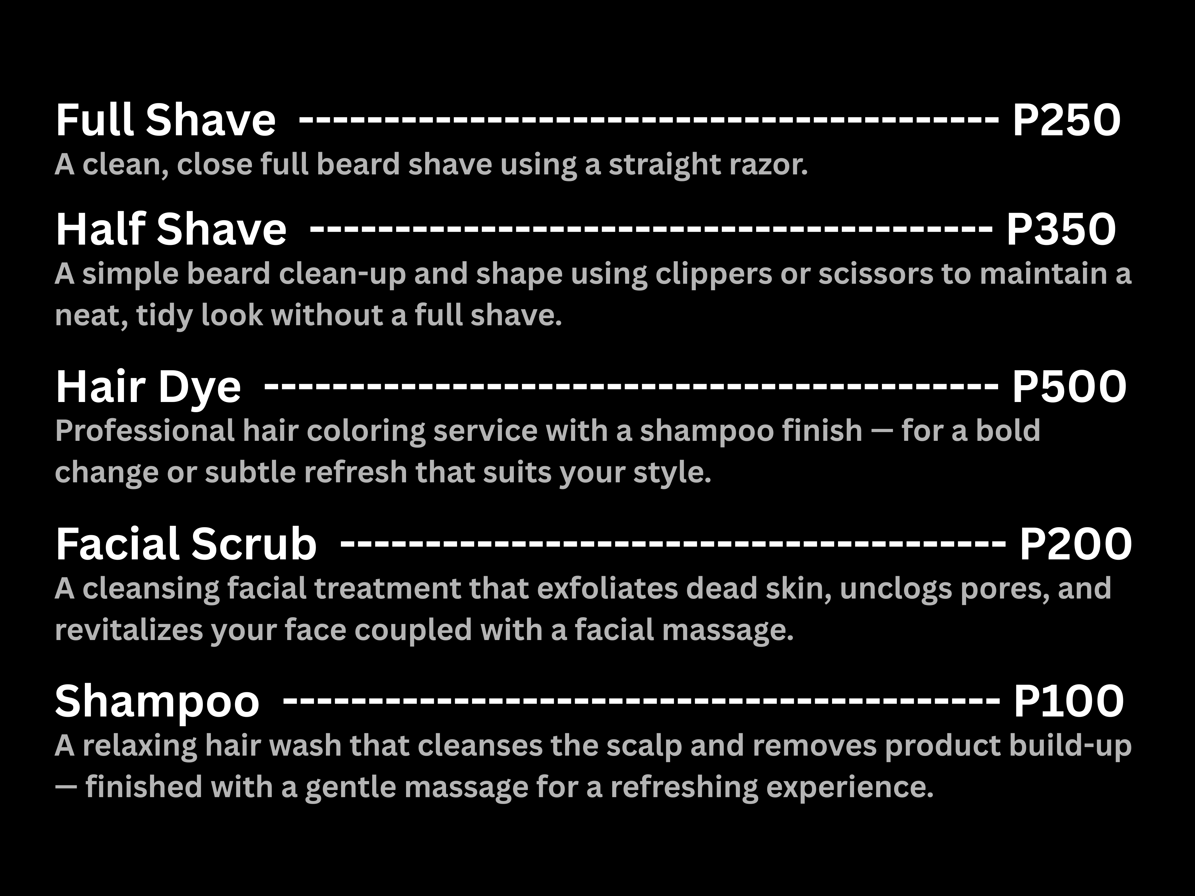 Whether you're refreshing your go-to look or trying something new, our skilled barbers are here to elevate your grooming game with expert care, attention to detail, and great conversation.